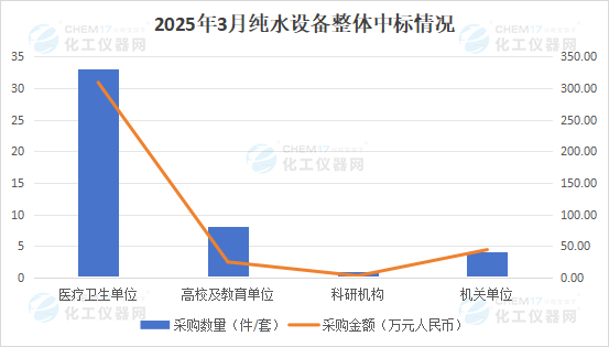 根據(jù)化工儀器網(wǎng)不完全統(tǒng)計,2025年3月中國政府采購網(wǎng)上的純水設(shè)備中標(biāo)項目共34項,除去信息未完全公開的中標(biāo)項目,可以統(tǒng)計到的成交總數(shù)為48套/臺,中標(biāo)總金額達(dá)379.75萬元,平均單價為8.26萬元。大部分采購需求來自醫(yī)療衛(wèi)生單位。