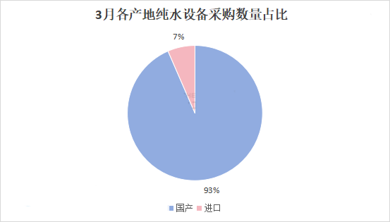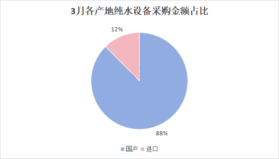 從“3月各產(chǎn)地純水設(shè)備采購數(shù)量占比”及“3月各產(chǎn)地純水設(shè)備采購金額占比”兩項數(shù)據(jù)來看,無論是數(shù)量還是總價,國產(chǎn)純水設(shè)備的市場占有率都更高。