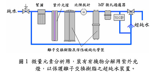 超純水系統(tǒng)的純化方法中,用來去除離子的是離子交換樹脂,因此維持樹脂的交換能力是很重要的。離子交換樹脂除了會因為官能基飽和而降低去除能力外,樹脂表面也會發(fā)生有機物質(zhì)與微生物的附著,所以在離子交換樹脂的前段處理程序中,最好使用紫外線燈來氧化分解有機物質(zhì),以防止樹脂被污染。此外,為了盡早發(fā)覺樹脂的劣化,所以可以在前段的離子交換管匣之后裝上比阻抗計,以偵測水質(zhì)的變化(圖1)。這種超純水系統(tǒng)的組合,對水中所含元素的偵測靈敏度可達 ppt 級。