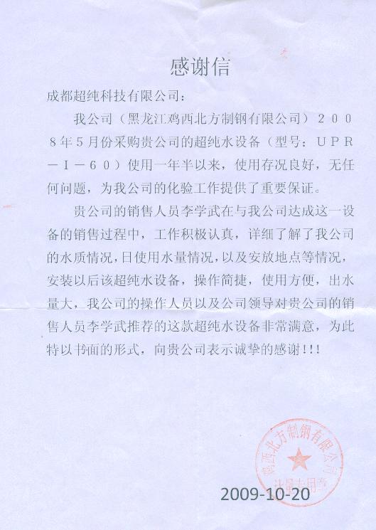 我公司(黑龍江雞西北方制鋼有限公司)2008年5月份采購(gòu)貴公司的超純水設(shè)備(型號(hào):UPR-I-60)使用一年半以來(lái),使用情況良好,無(wú)任何問(wèn)題,為我公司的化驗(yàn)工作提供了重要保證。貴公司的銷售人員李學(xué)武在與我公司達(dá)成這一設(shè)備的銷售過(guò)程中,工作積極認(rèn)真,詳細(xì)了解了我公司的水質(zhì)情況,日使用水量情況,以及安放地點(diǎn)等情況,安裝以后該超純水設(shè)備,操作簡(jiǎn)捷,使用方便,出水量大,我公司的操作人員以及公司領(lǐng)導(dǎo)對(duì)貴公司的銷售人員李學(xué)武推薦的這款超純水設(shè)備非常滿意,為此特以書面形式,向貴公司表示誠(chéng)摯的感謝!!!2009-10-20