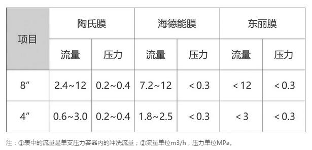 1、沖洗一般在RO系統(tǒng)開機前或者停機后進行沖洗,采用RO進水或者產水。部分膜廠家提供的沖洗指標如下: