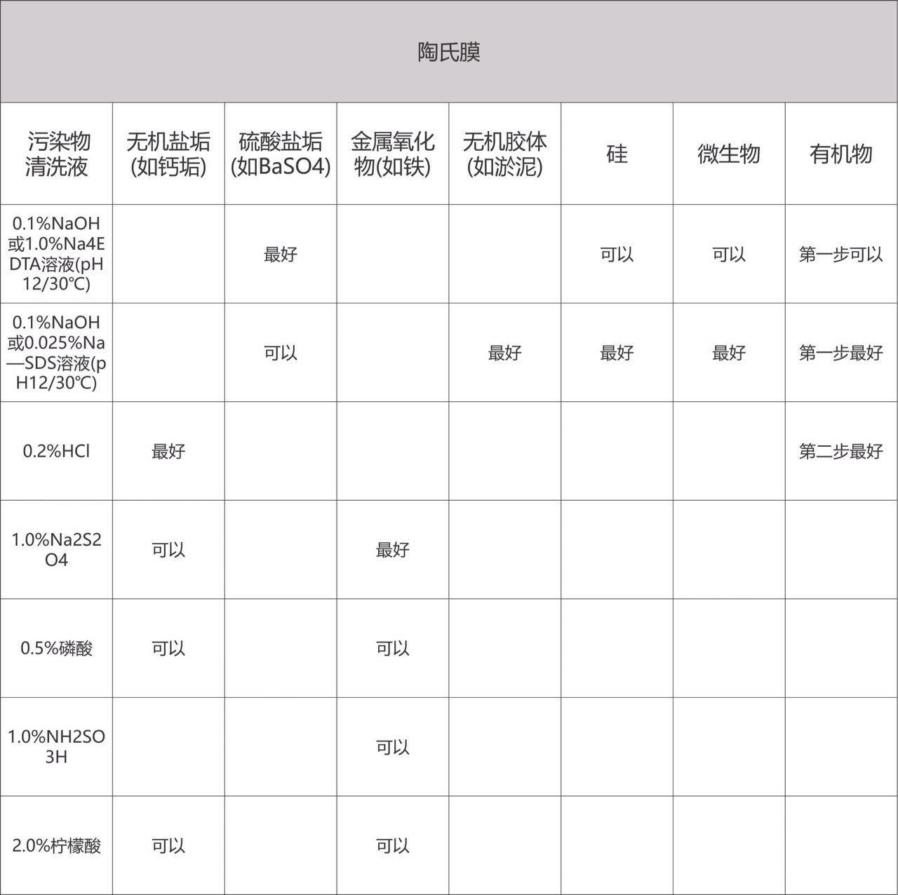 3、不同膜廠家推薦的清洗液