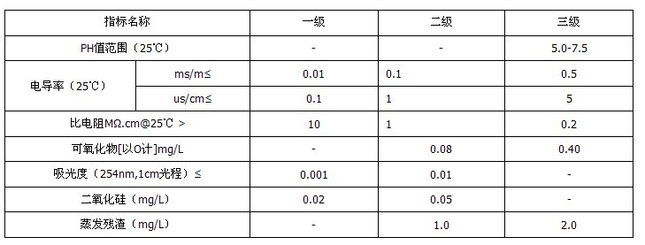 補(bǔ)充說明:由于在一級(jí)和二級(jí)水的純度下,難于測(cè)定其真實(shí)的pH值,因此對(duì)一級(jí)和二級(jí)水的pH值范圍國標(biāo)不作規(guī)定;由于在一級(jí)水的純度下,難于測(cè)定可氧化物質(zhì)和蒸發(fā)殘?jiān)?,?duì)其限量不做規(guī)定,可用其它條件和制備方法來保證一級(jí)水的質(zhì)量。