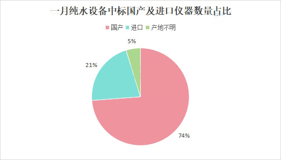 從“一月純水設(shè)備中標(biāo)國(guó)產(chǎn)及進(jìn)口儀器數(shù)量占比”及“一月純水設(shè)備中標(biāo)國(guó)產(chǎn)及進(jìn)口儀器金額占比”兩項(xiàng)數(shù)據(jù)來(lái)看,無(wú)論是數(shù)量還是總價(jià),國(guó)產(chǎn)純水設(shè)備的市場(chǎng)占有率都更高。